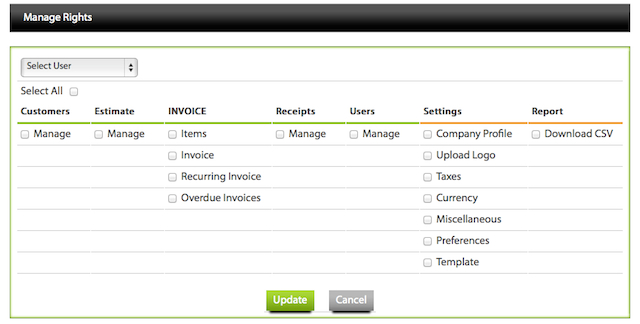 User Rights tiny yet indispensable feature in Shimbi Invoice that makes it easier for you to control what your employees can access and makes your data inviolable and organization efficient. This is the perfect feature for any mid size company.