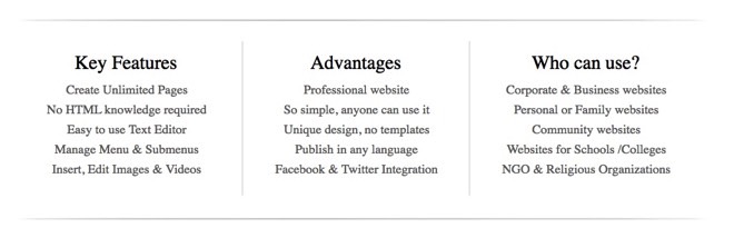 Example: In our website, we created a simple information block with three columns (Key Features, Advantages and Who can use?) with bulleted points for each.